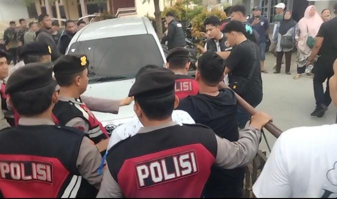 Situasi memuncak saat keluarga dan kerabat berusaha menghadang mobil aparat. Adu dorong terjadi hingga kendaraan polisi dilaporkan menyenggol pagar rumah korban.